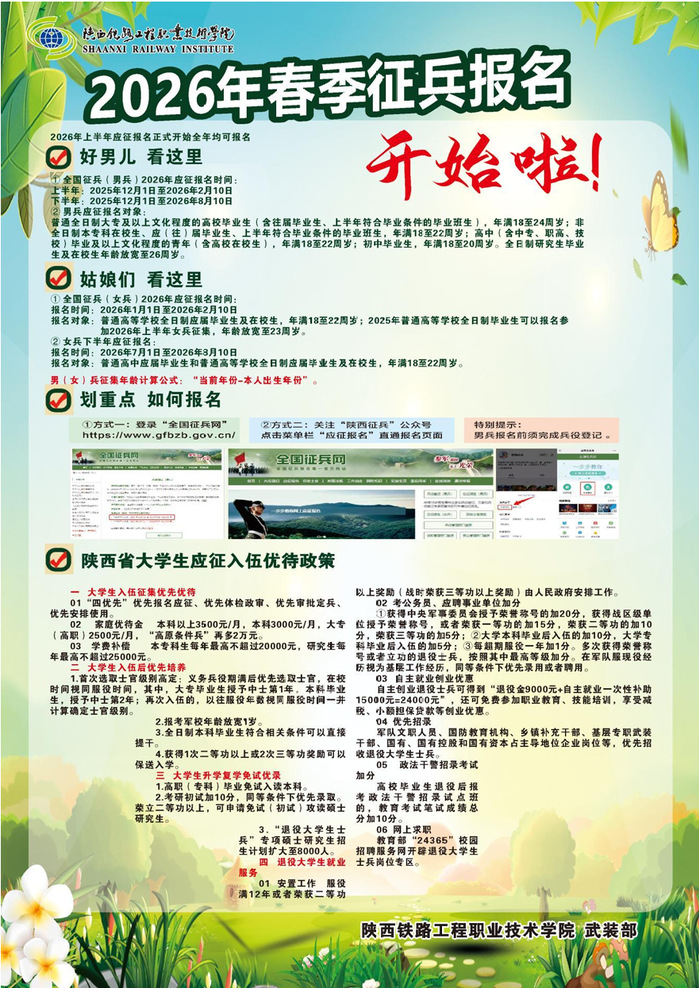 为深入贯彻上级关于鼓励大学生参军入伍的工作要求,进一步强化宣传动员力度,重点引导毕业学生响应号召、投身国防,选拔输送优质兵员助力国防和军队现代化建设,根据征兵工作相关规定,现就我校 2026 年春季大学生征兵工作有关事项通知如下: