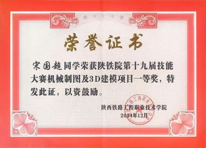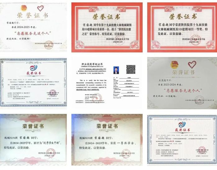 赛场与课堂并重,理论与实践相融。宋国超始终秉持“以赛促学、以学促行”的理念,积极投身各类学科竞赛与创新活动,屡获佳绩。他先后荣获2023—2024学年陕铁院互联网+大学生创新大赛银奖、第八届大学生挑战杯大赛铜奖,2023—2024学年、2024—2025学年陕西省大学生创新大赛铜奖,2024—2025学年陕铁院19届技能大赛“机械制图技能之星”等多项荣誉,在比拼中锤炼技能、突破自我。